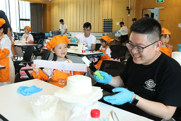小朋友們稍作休息之后就進入了今天的重頭戲——親子DIY蛋糕。大家穿上圍裙,戴上廚師帽,化身小小烘焙師,跟隨著專業的蛋糕老師,從放蛋糕坯、擠奶油,再到抹面、裝飾。大家都聚精會神,認真聽著老師講解,有條不紊地進行制作,最終一個個精美的卡通蛋糕在一雙雙巧手中誕生,小朋友們迫不及待地與自己的作品合影,記錄下這一成就感滿滿的時刻!
