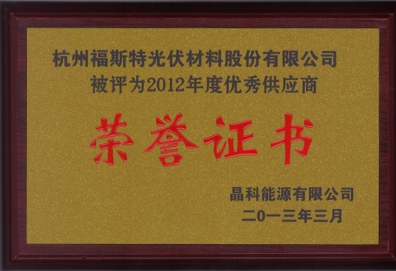 熱烈祝賀福斯特被評為晶科能源有限公司2012年度優秀供應商。