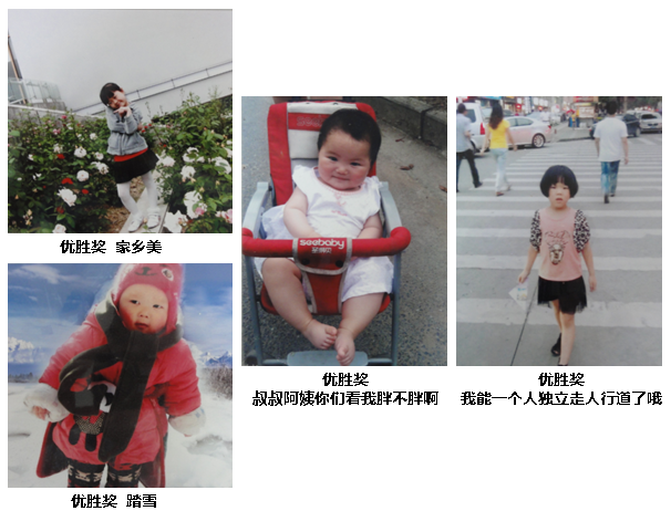 本次活動共收集到31幅作品參賽,作品有展現孩子盟意盎然的睡姿,有展現孩子淘氣喜人的表情,有展現孩子時尚新潮的非凡個性,還有展現懂事孝順、清新脫俗的真善美……父母們用相機給我們可愛的寶寶們記錄下了最型最美的瞬間。活動經過現場展覽大眾投票環節及評審小組評選,最終選出了一、二、三等獎及優勝獎共10名作品。