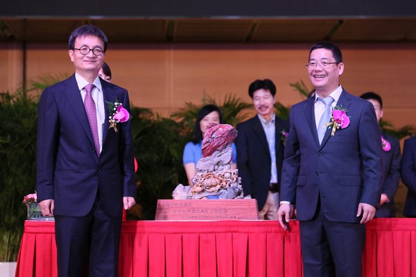 上海證券交易所總經(jīng)理助理夏建亭與福斯特董事長(zhǎng)林建華互贈(zèng)紀(jì)念品