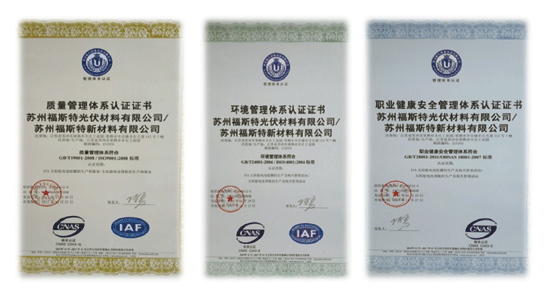 在全體員工的不懈努力下,經北京聯合智業(yè)認證公司認證,蘇州福斯特質量管理體系、環(huán)境管理體系、職業(yè)健康安全管理體系符合ISO9001:2008、ISO14001:2004、OHSAS18001:2007體系標準,順利通過“QEO三體系”認證,并于2014年11月28日獲得認證證書。