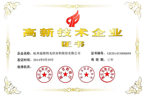 杭州福斯特光伏材料股份有限公司(以下簡稱“公司”)近日收到浙江省科學技術廳、浙江省財政廳、浙江省國家稅務局、浙江省地方稅務局聯合頒發的“高新技術企業證書”,證書編號為GR201433000699,發證日期為2014年9月29日,有效期三年。