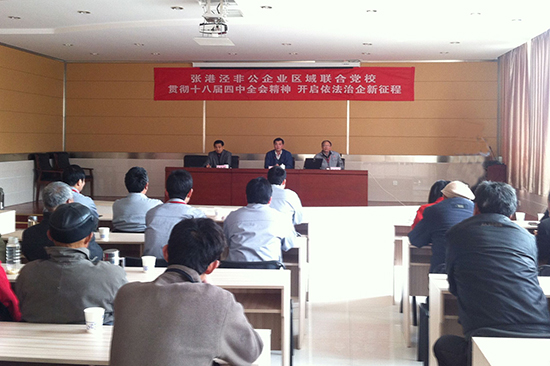 4月9日下午,張港涇村非公企業聯合黨校黨課教育活動在蘇州福斯特舉行。活動特邀常熟市委黨校高級講師邵鐳以“貫徹十八屆四中全會精神,開啟依法治企新征程”為主題作專題講座,村黨委全體黨員和轄區企業黨員干部共90多人參加了本次活動。