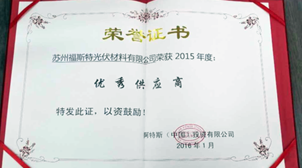 2016年開年之際,福斯特再獲佳績。1月20日,蘇州福斯特光伏材料有限公司應邀參加阿特斯年度供應商頒獎活動,并榮獲阿特斯2015年度優秀供應商。