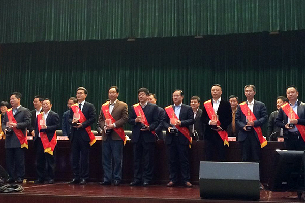福斯特董事長林建華(左三)被評為臨安市“十二五”杰出貢獻企業家并接受大會表彰